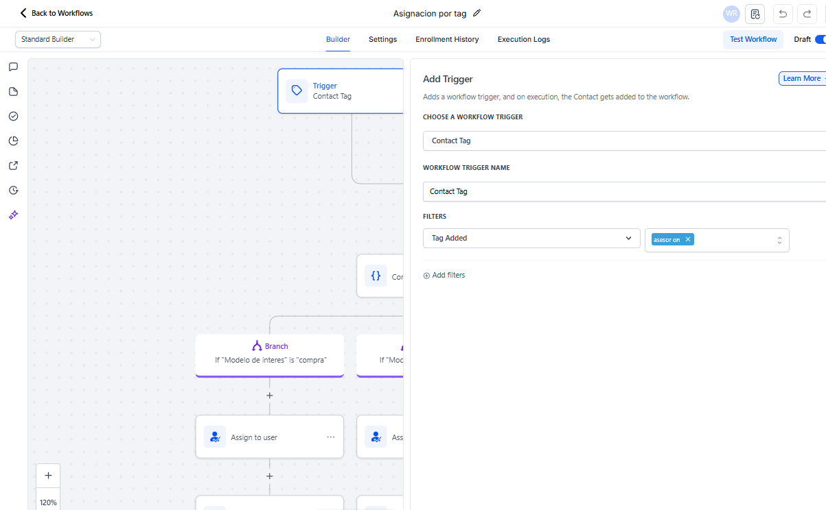 Después del trigger, el workflow evalúa el campo personalizado Modelo de interes.