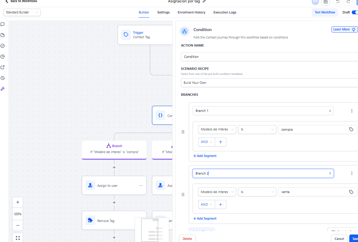 Esta acción se configura de manera independiente en cada rama, lo que permite aplicar reglas distintas según el tipo de lead.