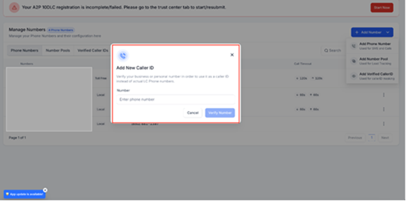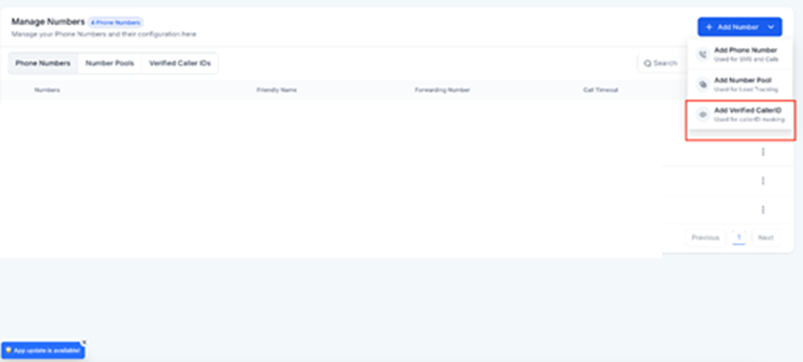 Haz clic en Add Verified Caller ID (Agregar identificador de llamadas verificado) en la pestaña Add Number (Agregar número).